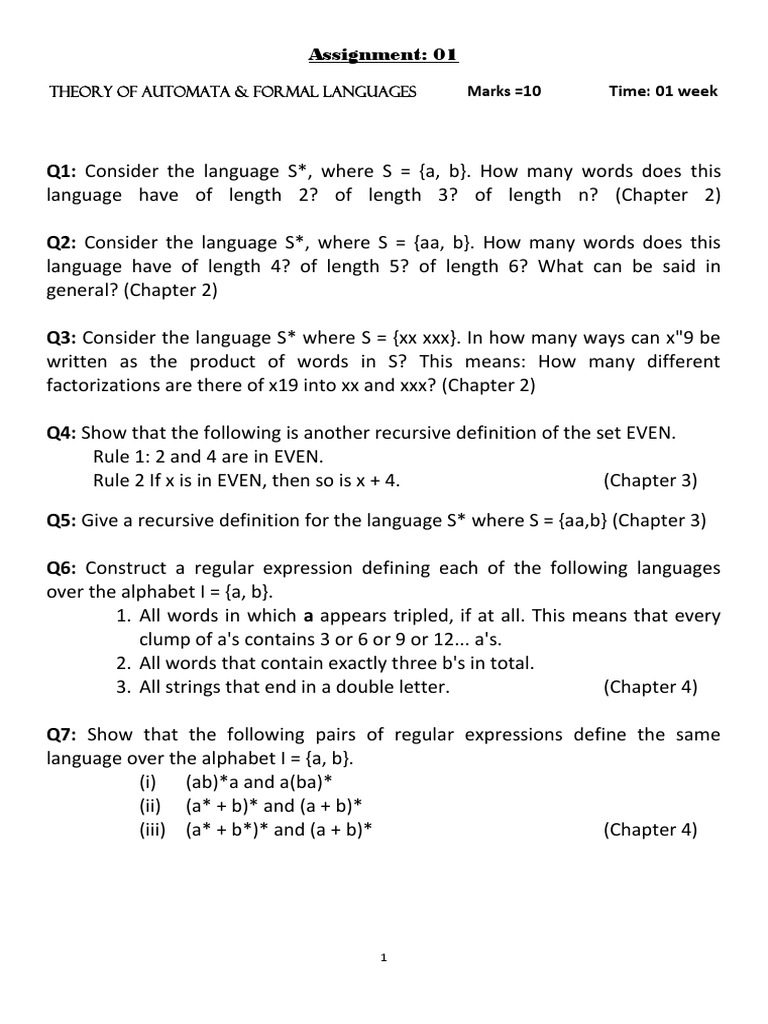 THEORY OF AUTOMATA & FORMAL LANGUAGES Marks =10 Time: 01 week
