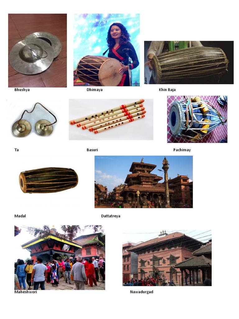 The document lists several musical instruments and deities including Bhushya, Dhimaya, Khin Baja, Ta, Basuri, Madal, Dattatreya, Maheshwori and Nawadurgad. It appears to be listing traditional instruments and gods or goddesses but provides no other context around their relationship or purpose in the listing.