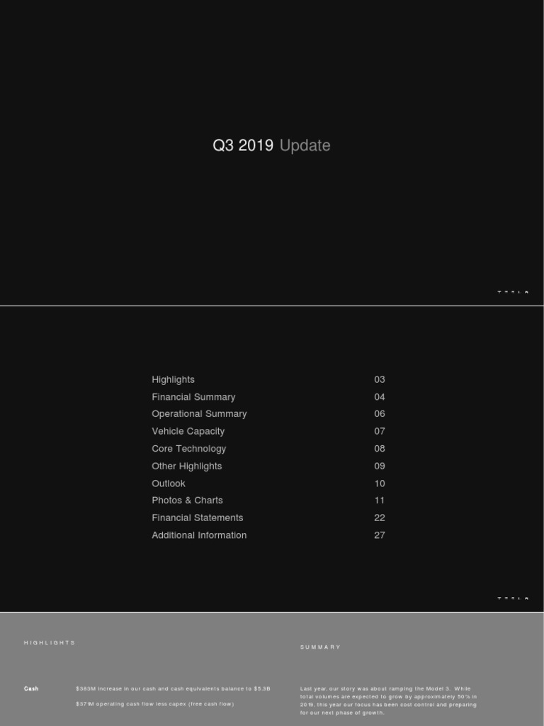 Tesla will provide a live webcast of its third quarter 2019 financial results conference call beginning at 3:30 p.m. PT on October 23, 2019, at ir.tesla.com. This webcast will also be available for replay for approximately one