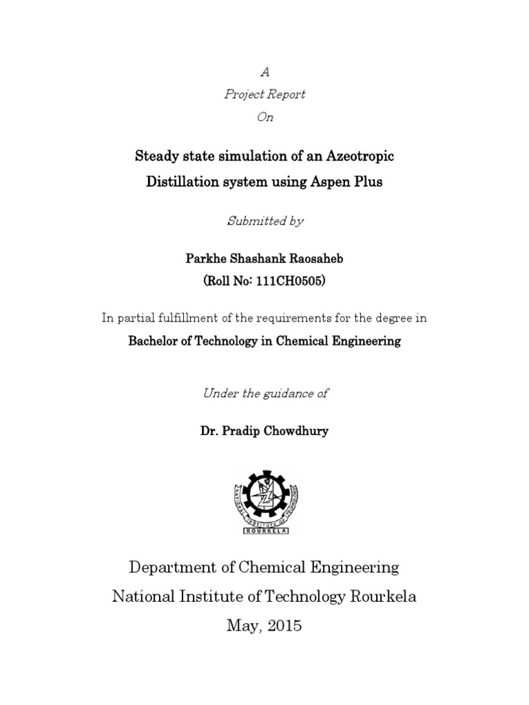 Azeotropic distillation system using Aspen Plus,” submitted by Parkhe Shashank Raosaheb