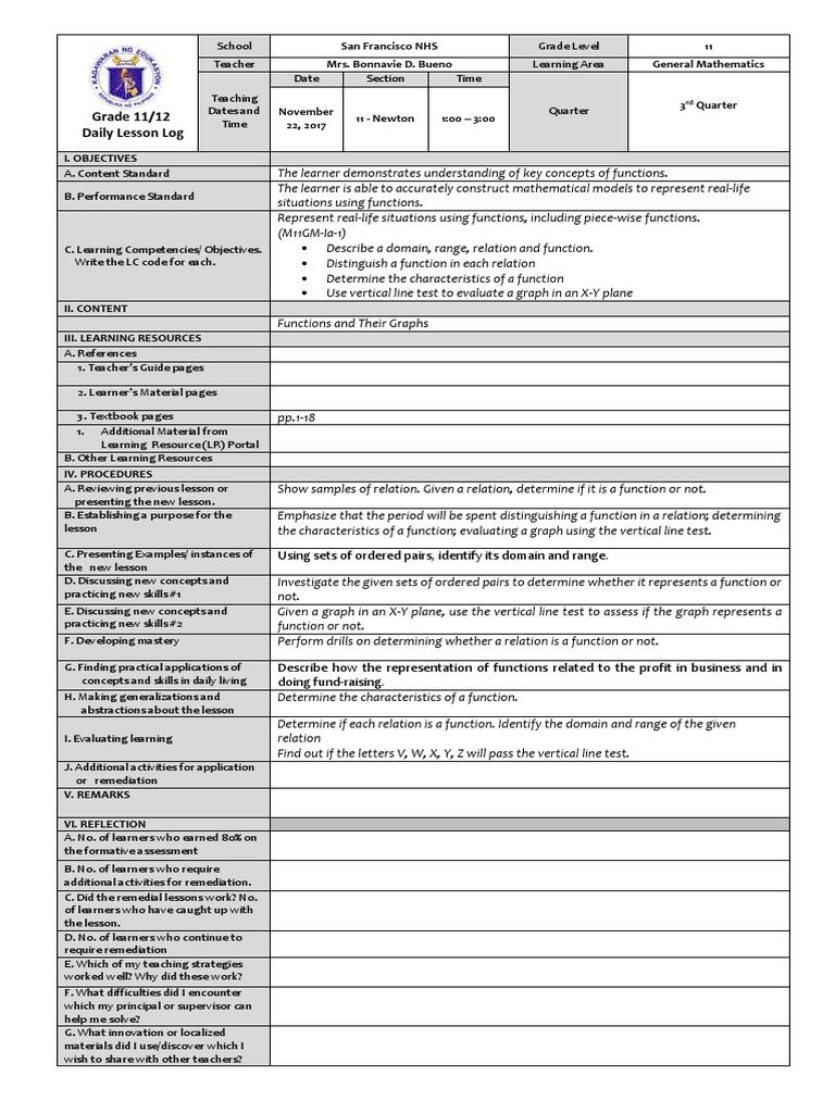 Teacher Mrs. Bonnavie D. Bueno Learning Area General Mathematics