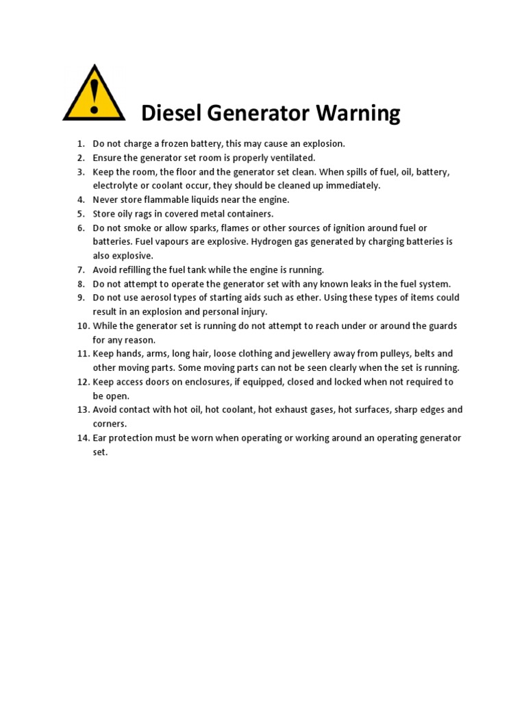 3. Keep the room, the floor and the generator set clean. When spills of fuel, oil, battery,