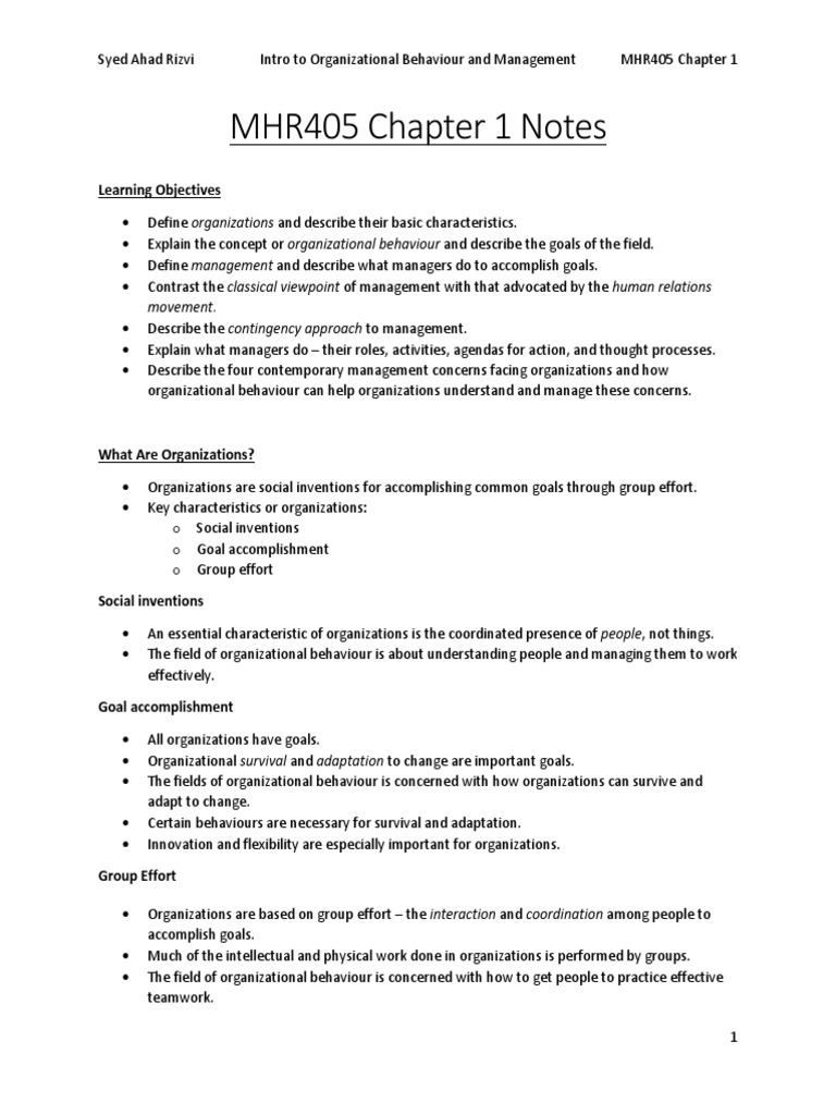 Syed Ahad Rizvi Intro to Organizational Behaviour and Management MHR405 Chapter 1
