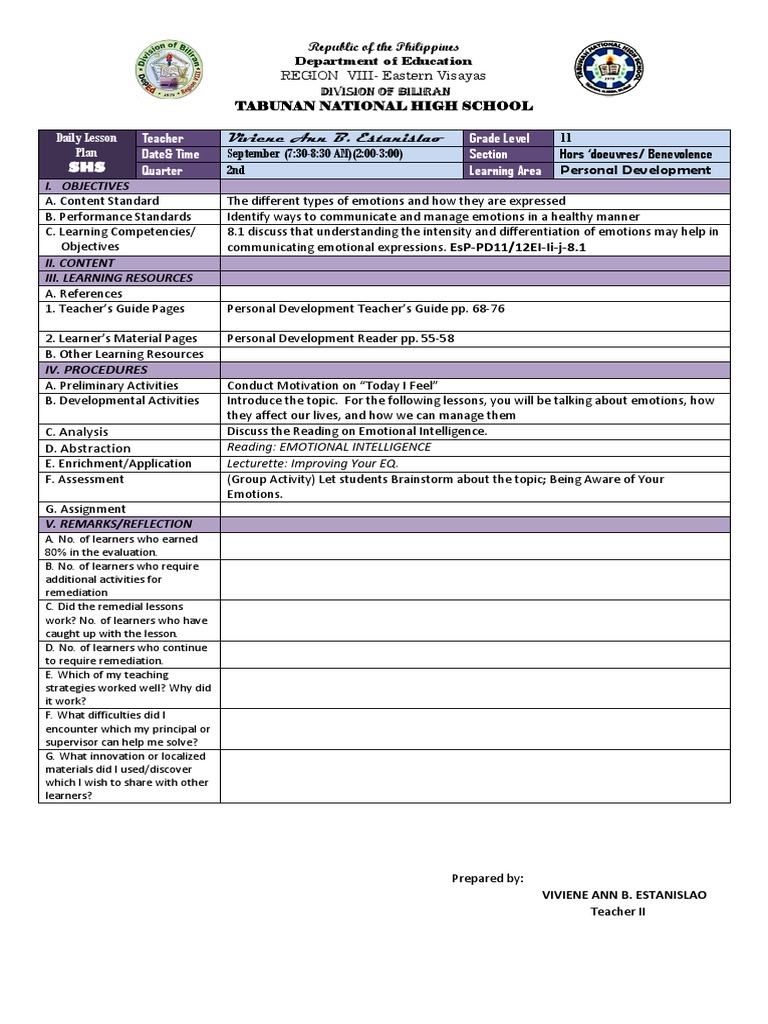 Daily Lesson Teacher Viviene Ann B. Estanislao Grade Level 11