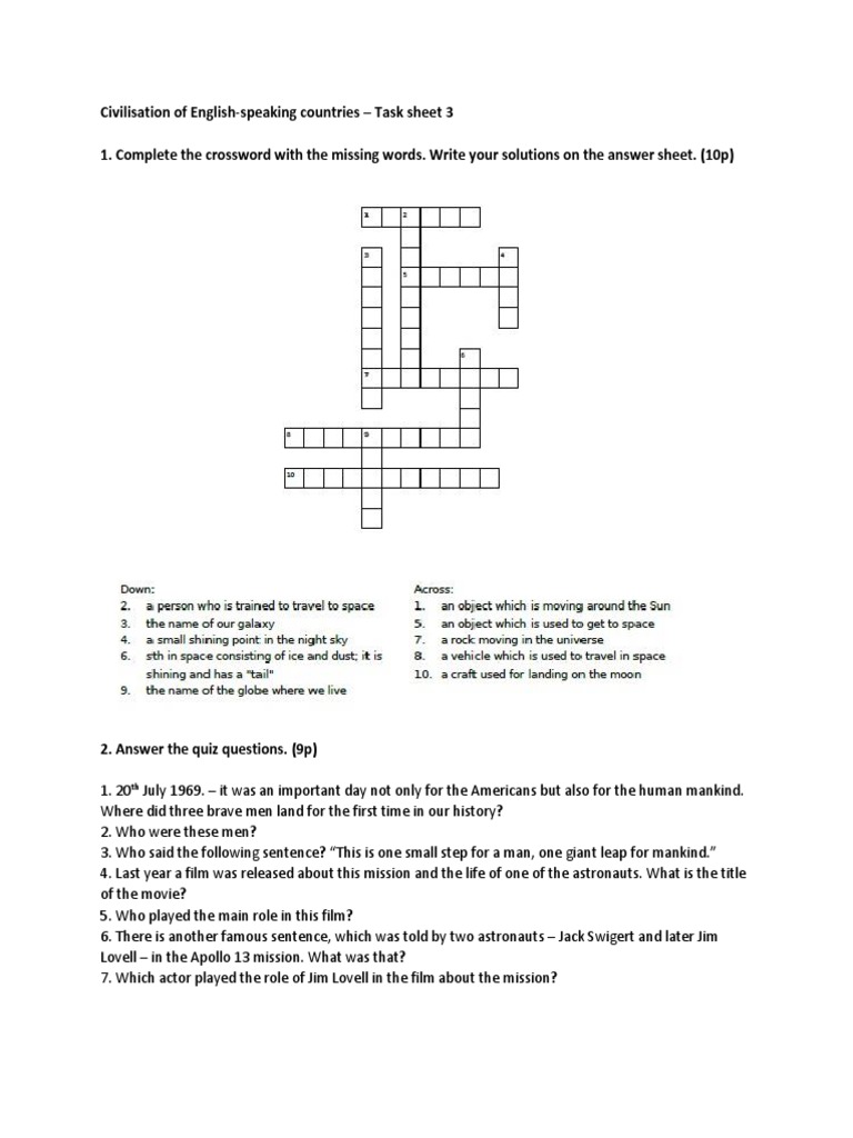 1. Complete the crossword with the missing words. Write your solutions on the answer sheet. (10p)