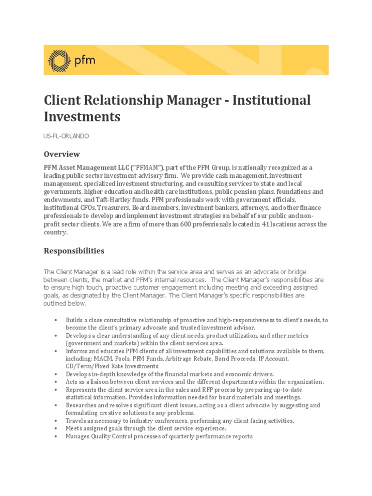 between clients, the market and PFM’s internal resources. The Client Manager’s responsibilities are