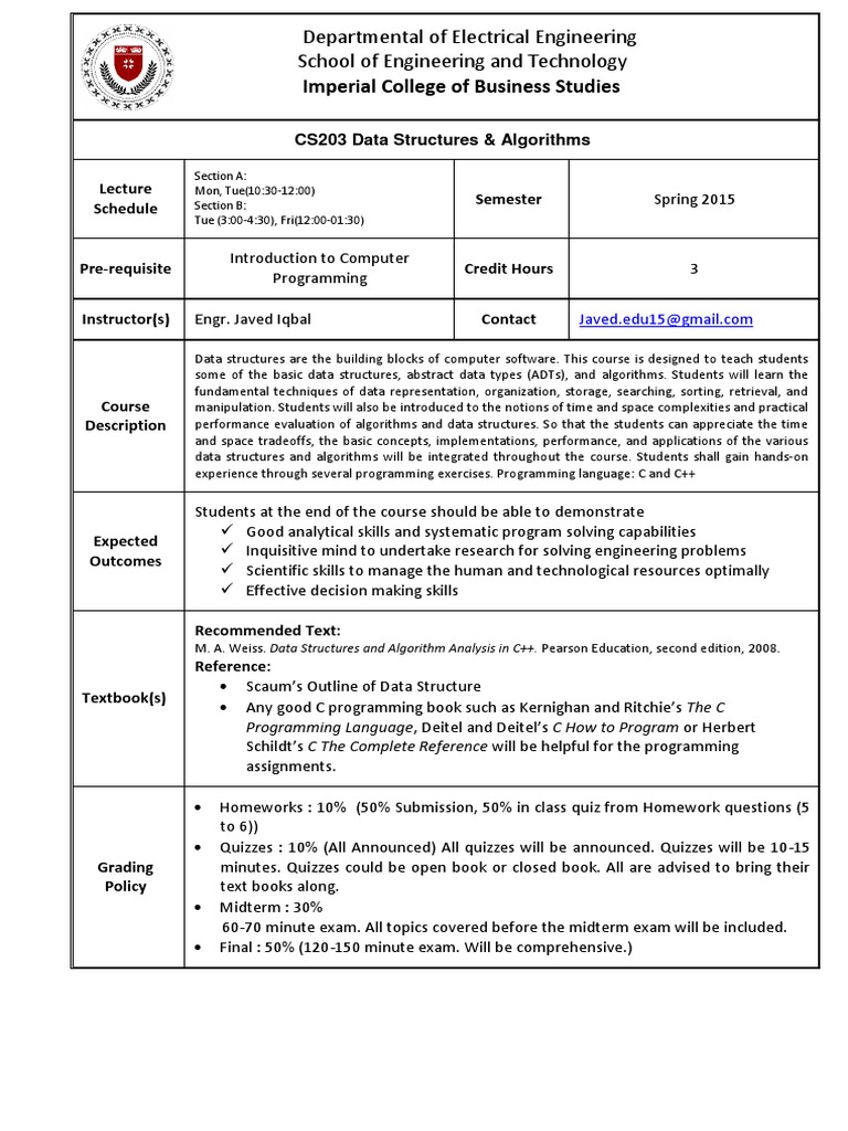 Instructor(s) Engr. Javed Iqbal Contact Javed.edu15@gmail.com