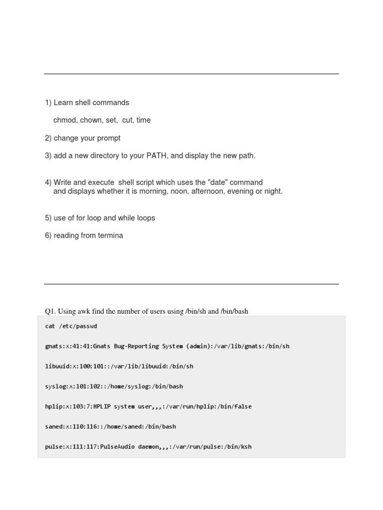 Q1. Using awk find the number of users using /bin/sh and /bin/bash