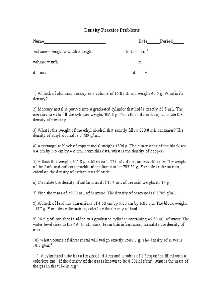 1) A block of aluminum occupies a volume of 15.0 mL and weighs 40.5 g. What is its