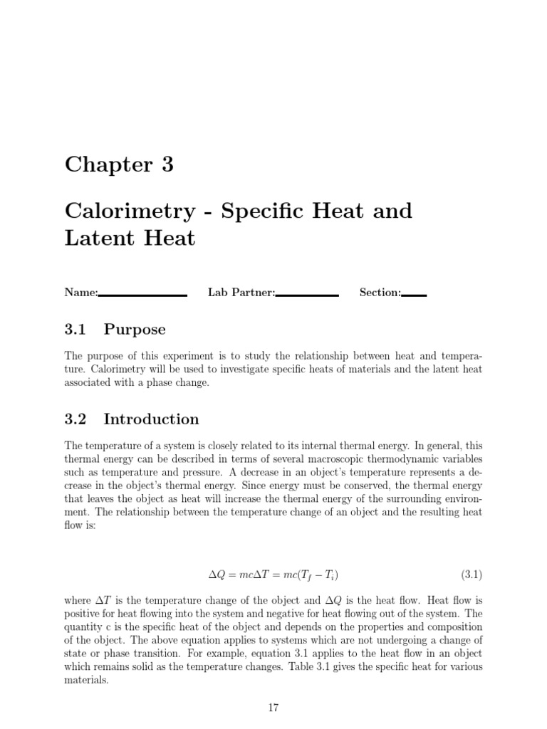 ture. Calorimetry will be used to investigate specific heats of materials and the latent heat