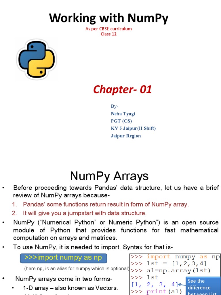 NumPy arrays arr also known as ndarray (n-dimentional array)