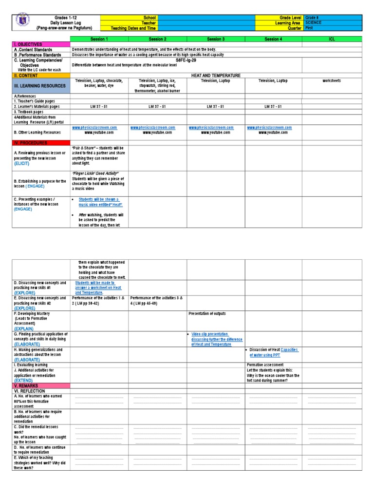 Daily Lesson Log Teacher Learning Area SCIENCE