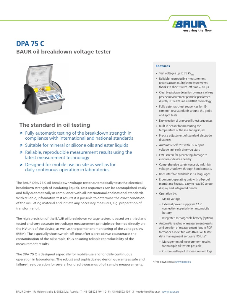 The high precision of the BAUR oil breakdown voltage testers is based on a tried and –– Integrated rechargeable battery (option)