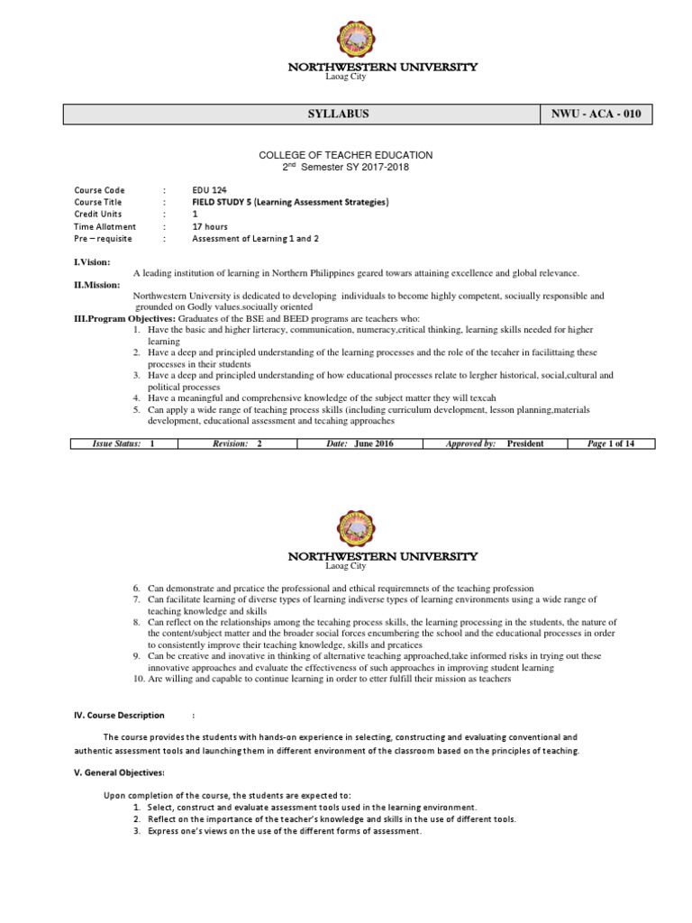 Course Title : FIELD STUDY 5 (Learning Assessment Strategies)