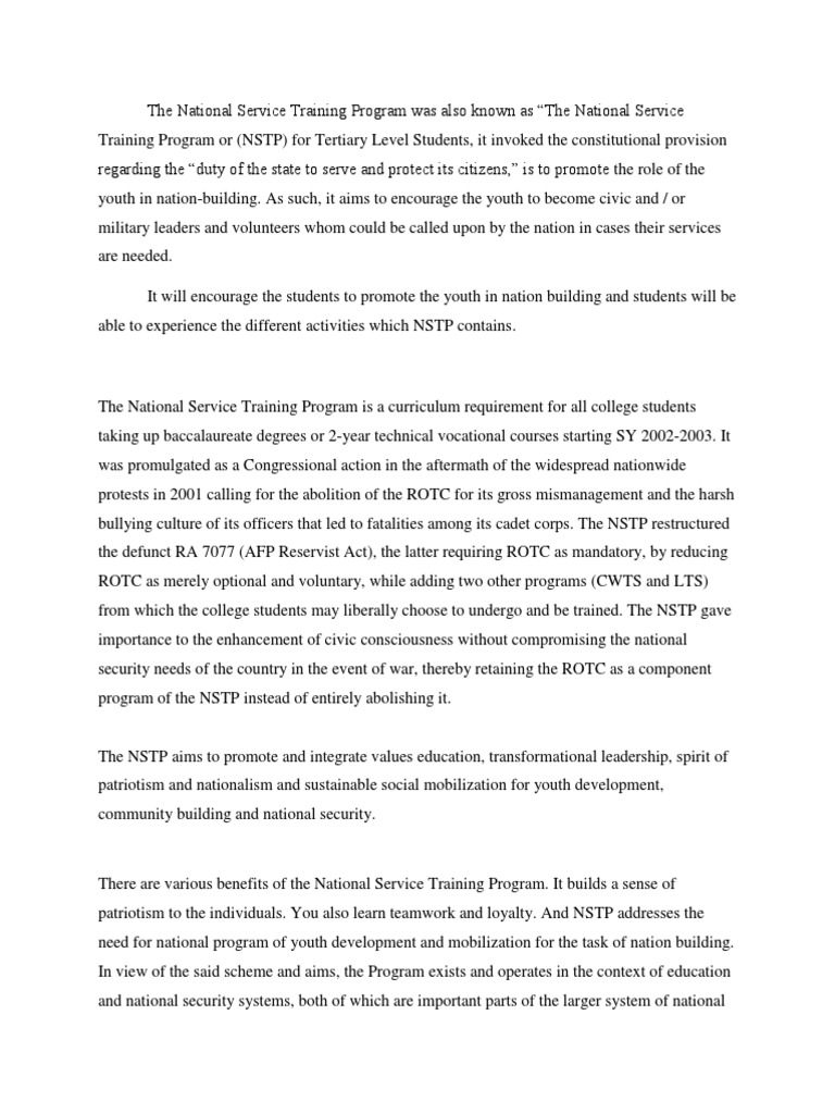 patriotism to the individuals. You also learn teamwork and loyalty. And NSTP addresses the