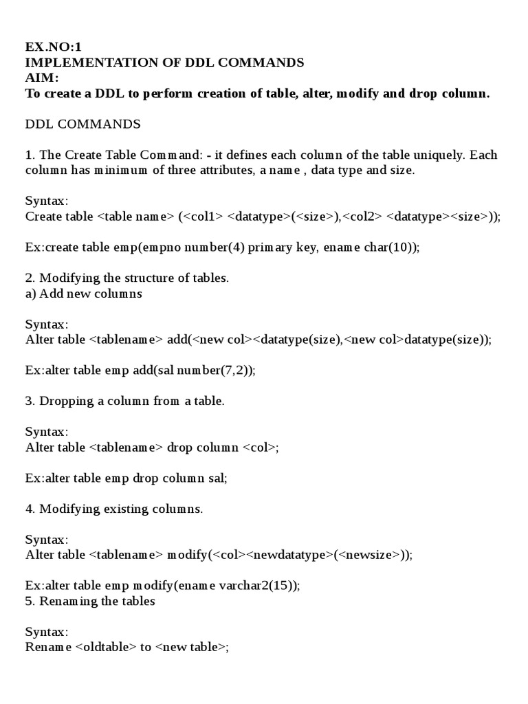 To create a DDL to perform creation of table, alter, modify and drop column.