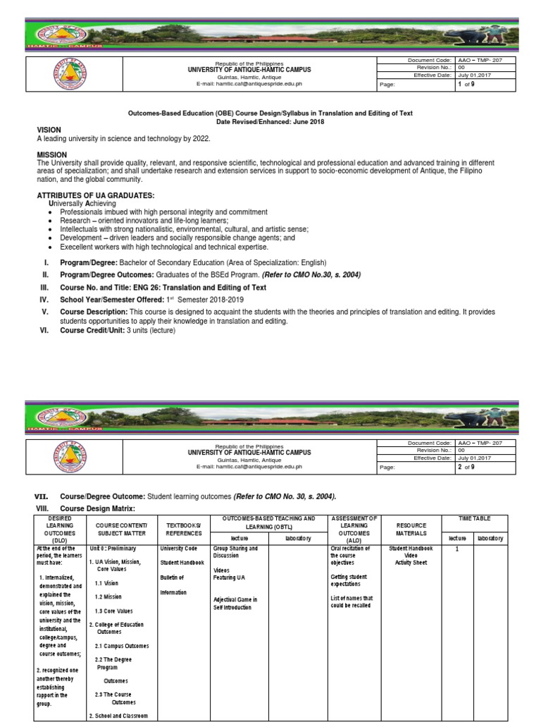 Outcomes-Based Education (OBE) Course Design/Syllabus in Translation and Editing of Text