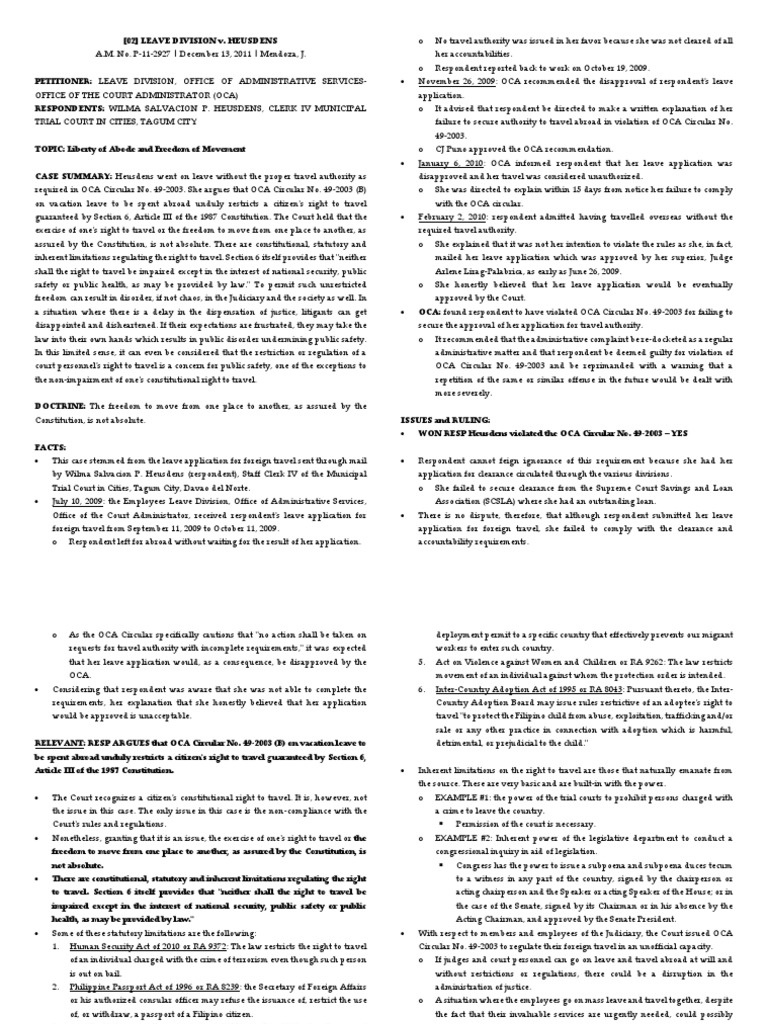 TOPIC: Liberty of Abode and Freedom of Movement o CJ Puno approved the OCA recommendation.