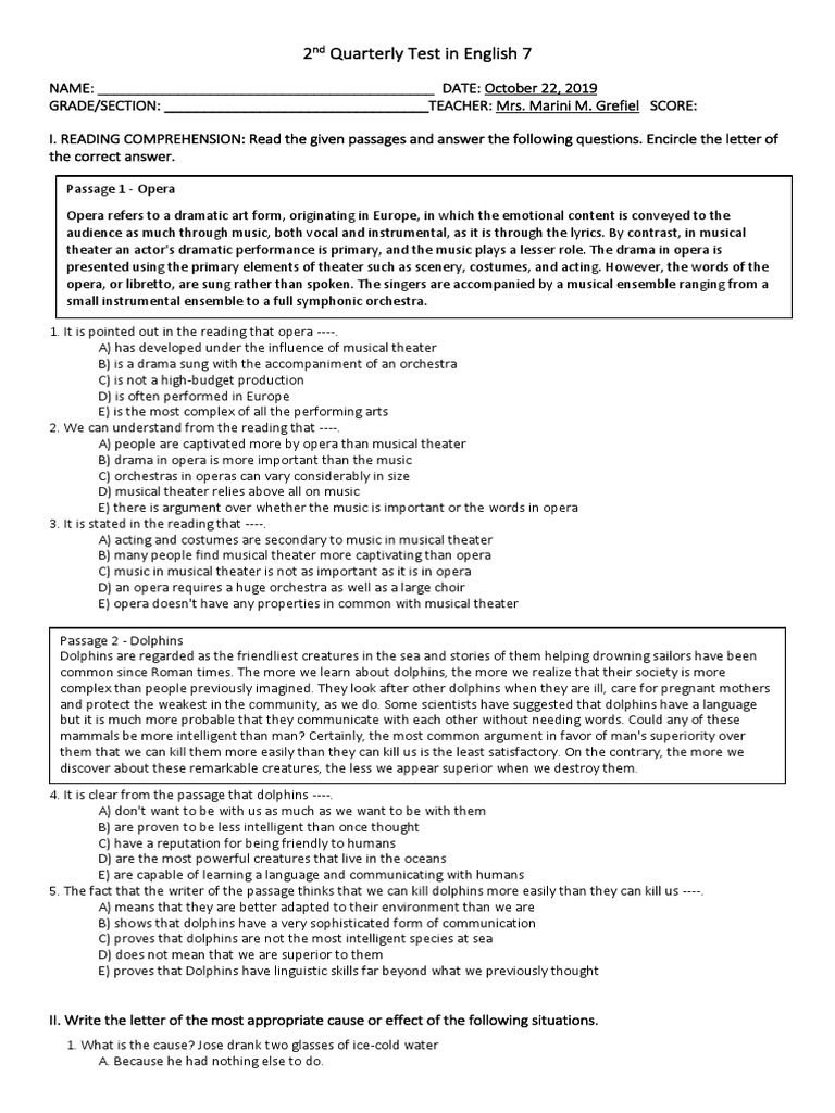 GRADE/SECTION: _________________________________TEACHER: Mrs. Marini M. Grefiel SCORE: