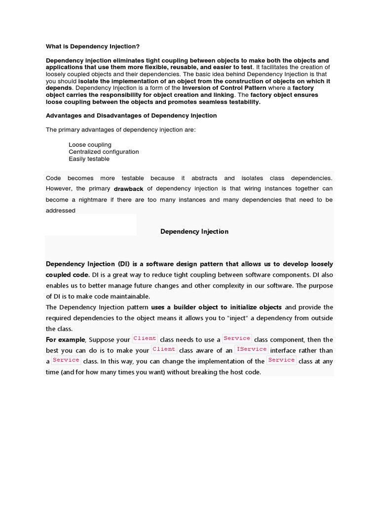 coupled code. DI is a great way to reduce tight coupling between software components. DI also
