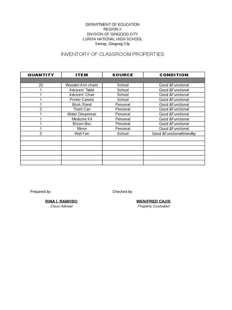 INVENTORY OF CLASSROOM PROPERTIES