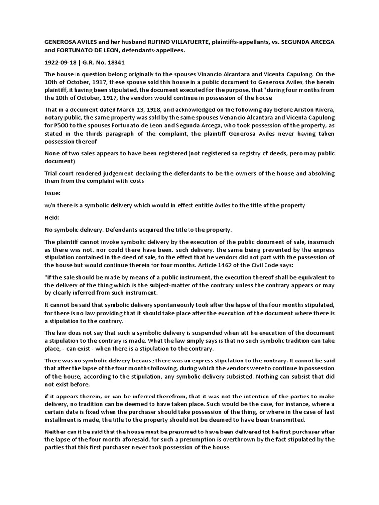 w/n there is a symbolic delivery which would in effect entitle Aviles to the title of the property