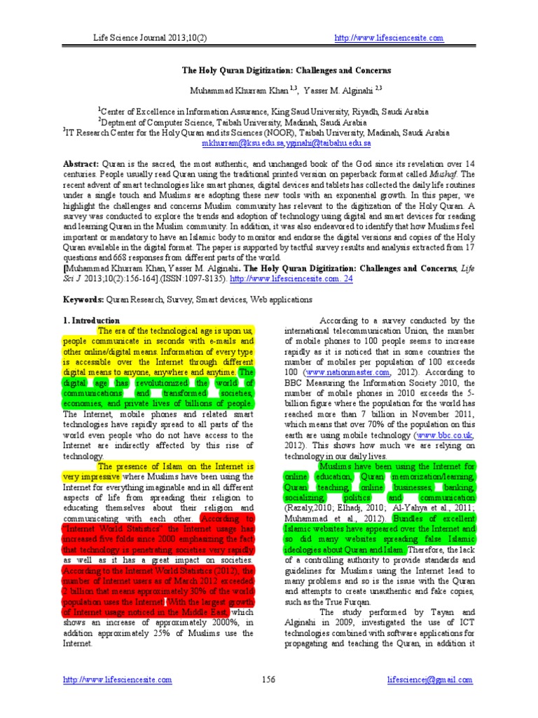 [Muhammad Khurram Khan, Yasser M. Alginahi. The Holy Quran Digitization: Challenges and Concerns, Life