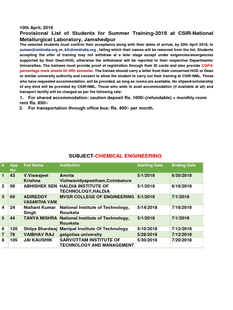 Provisional List of Students for Summer Training-2018 at CSIR-National