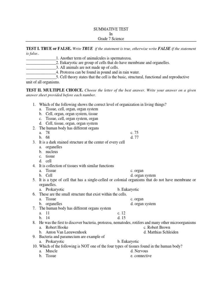 TEST III. MATCHING TYPE. Match the people behind the discovery of the cell on column A