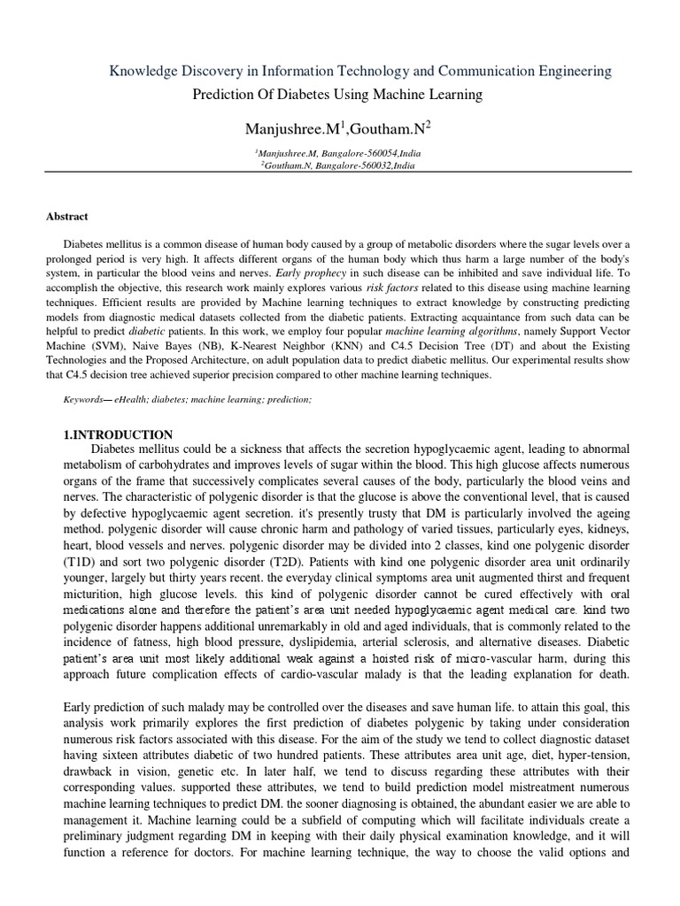 (NB), K-Nearest Neighbor (KNN) and C4.5 call tree (DT), on adult population knowledge to predict diabetic