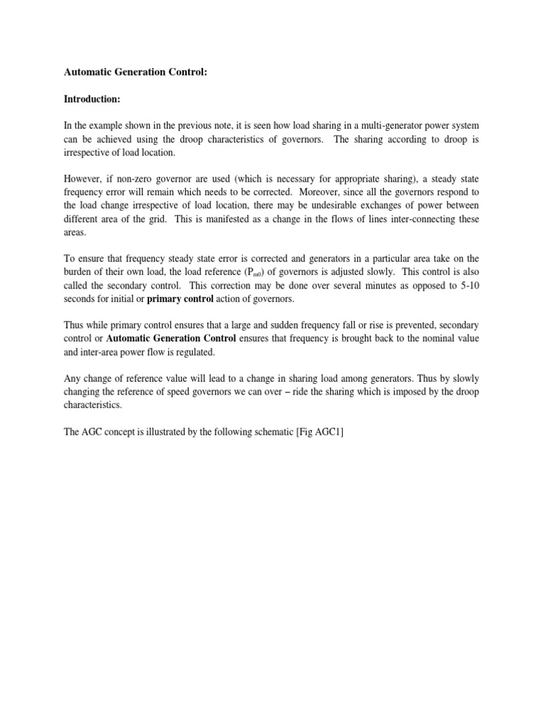 control or Automatic Generation Control ensures that frequency is brought back to the nominal value