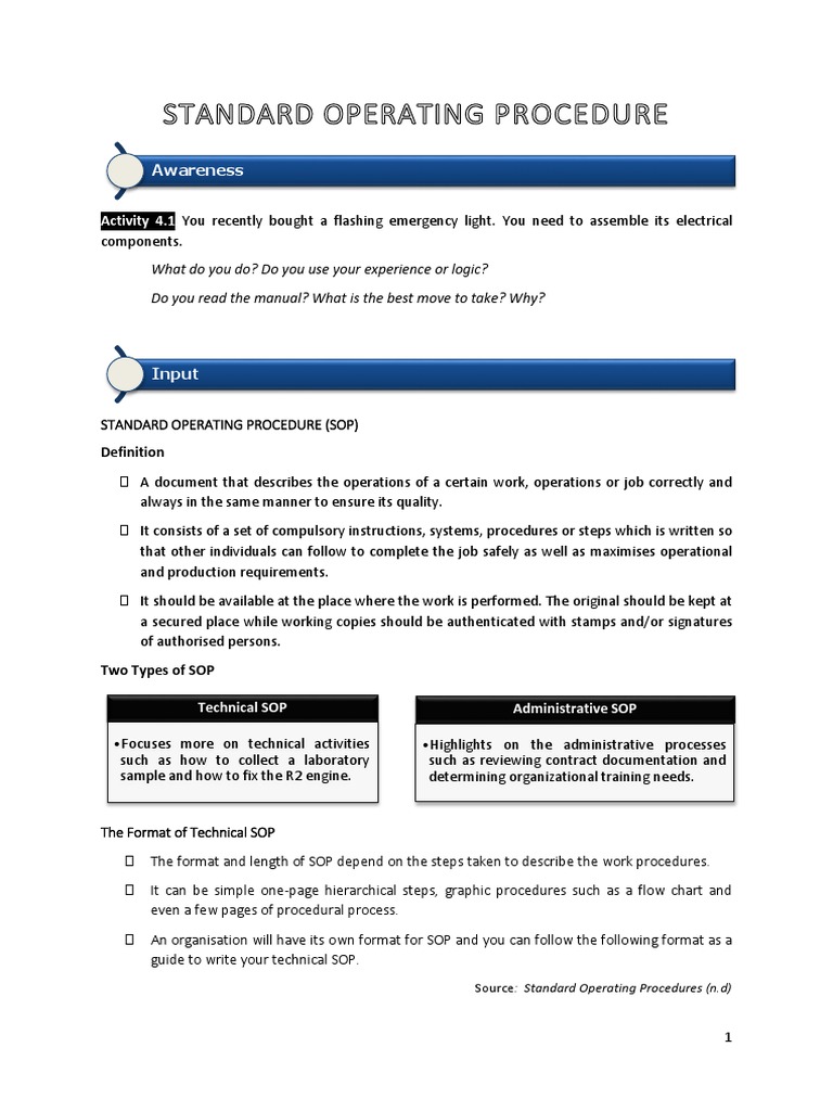 Activity 4.3 Based on the title of the SOP that you have written in Activity 4.2, identify the