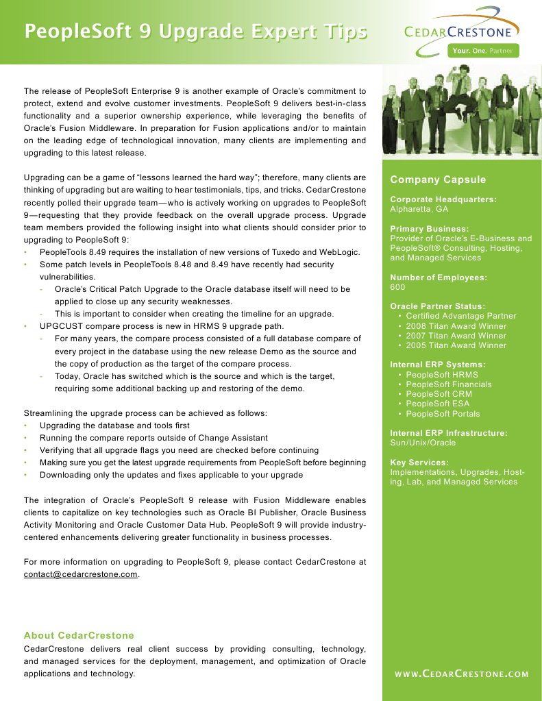 For more information on upgrading to PeopleSoft 9, please contact CedarCrestone at