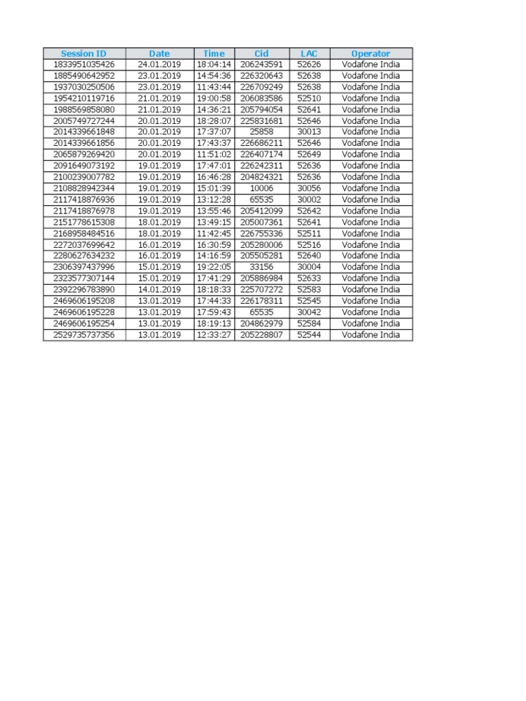Session ID Date Time Cid LAC Operator