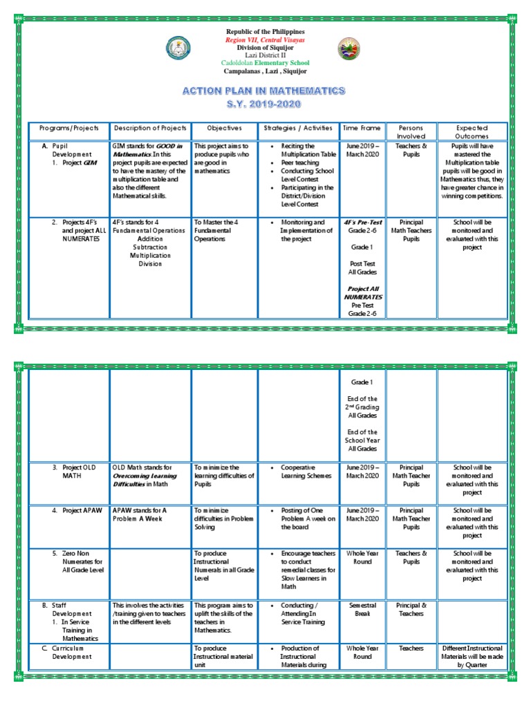 Programs/Projects Description of Projects Objectives Strategies / Activities Time Frame Persons Expected