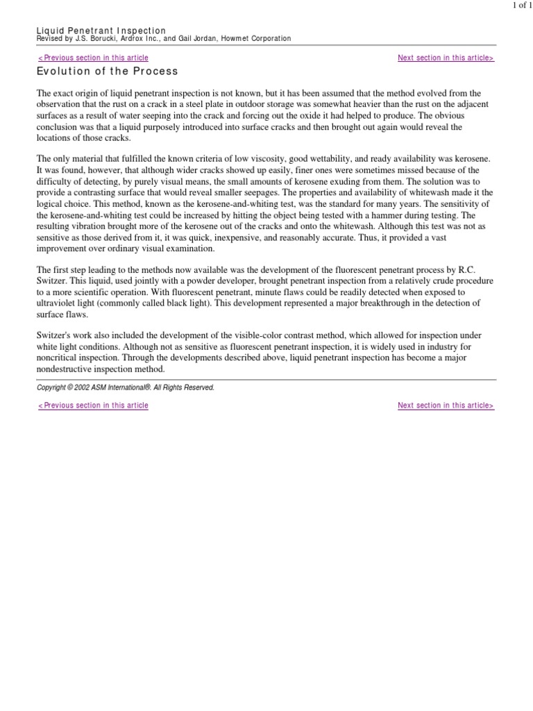 The first step leading to the methods now available was the development of the fluorescent penetrant process by R.C.