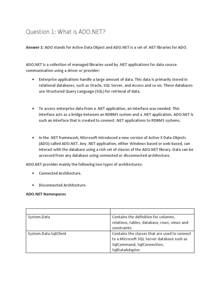Answer 1: ADO stands for Active Data Object and ADO.NET is a set of .NET libraries for ADO.