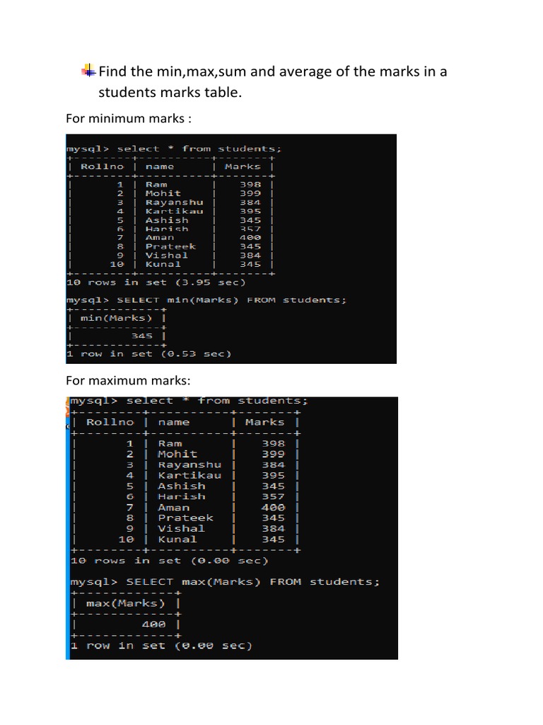 Find The Min, Max, Sum and Avg Marks SQL