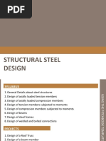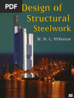0.8 up to 40mm thickness Rolled I- or H-section with welded cover plate U/B> 0.8 over 40mm thickness Rolled I- or H-section with welded cover plate U/B<0.25 up to 40mm thickness Rolled I- or H-section with welded cover plate U/B<0.25 over 40mm thickness Rolled H-section up to 40 mm thickness with or without cover plate 0.25 < U/B<0.8 Rolled H-section over 40mm thickness with or without cover plate 0.25 < U/B<0.8 Welded box section up to 40mm thickness Welded box section over 40mm thickness Round, square or flat bar up to 40mm thickness Round, square or flat bar over 40 mm thickness Rolled angle, channel, T-section, battened or laced compound sections Find the Perry coefficient, which is given by: 1 = 0.001a(A — Ao) Find the Euler strength, which is given by: wE PE= X-X axis 2 2 2 35 55 35 38 35 55 35 35 35 58 55 YY axis 35 35 35 55 8.0 55 8.0 35 55 35 35 55176 Structural Steelwork Step 11 Step 12 Find the compressive strength p., which is given by: =— PHS _ where g = Px tn + Wipe o+@ —pepy)'? 2 For sections fabricated from plates by welding, the design strength p, should be reduced by 20N/mm. For slender elements of a section, pe should be found by using a reduced value of p, as found in Step 9. Alternatively, use Tables 25, 26 and 27 of BS 5950: Part I to find the compressive strength pc. Use a reduced value of p, as appropriate. Pe Determine compressive resistance For plastic, compact and semi-compact sections the compressive resist- ance P, is given by: Pc=Agpe where Ag=gross cross-sectional area For slender section, each clement of the section may have a different Pe depending on the classification of the element and its reduced py. ‘The compressive resistance will be the sum of the compressive resist- ance of each of the component elements. Unity check of columns with nominal moments Columns with nominal moments in simple construction may be checked using the unity equation of Clause 4.7.7 of BS 5950: Part 1. Find L, which is the distance between points on a strut or a column where the column is restrained about both axes. . L Aur = equivalent slenderness ratio of the column = os(Z) 7 ry = radius of gyration about the minor axis of the column or strut So EN} Axo = limiting equivalent slenderness ratio = 0.4( © y mr = Perry coefficient = 0.007 (Aur ~ Aro) > 0 (for a rolled section) = 2x 0.007 x Ato (for a welded section) <2 x 0.007(ALt — Avo) > 0 2 0.007 Arr — Avo) 2 0 Mp=plastic moment capacity=S,p, where 5, =plastic modulus of section Mpr-E 2 ‘iT Py Mg =elastic critical moment: MzMp $0 + (63 — MeMp}t Mp + (mt + 1I)Mg My = buckling resistance moment = where dz =Design of Struts 177 Step 13 Alternatively, the buckling resistance moment of the column or the strut can be found by reference to Clauses 4.3.7.3 and 4.3.7.4 and Tables 11 and 12 of BS 5950: Part 1. The following relationship should be satisfied: Fo Me My ey Agpc * Mes wa ~ where F,=ultimate compressive load M,=ultmate nominal bending moment about the X-X axis (major axis) acting simultaneously with F. M,=ultimate nominal bending moment about the ¥-Y axis (minor axis) acting simultaneously with F. Ag= gross cross-sectional area Pc= compressive strength as found in Step 10 (see also Step 11) Py = design strength as found in Step 10 Z,=elastic section modulus about the Y-¥ axis (minor axis) Mys=Mp= buckling moment of resistance of the simple column. For circular hollow sections, rectangular hollow sections and box sections with uniform wall thicknesses My =pySx= Mp, provided the slenderness ratio \ does not exceed the values given in Table 38 of Appendix B of BS 5950: Part 1. Unity checks for columns|struts with moments This unity check has to be done in two stages. Firstly the local section capacity check has to be carried out, and then an overall member buckling check has to be satisfied Local section capacity check Check shear capacity P, where: Pe =0.6pyAy Ay =eflective shear area =tD for rolled sections = for built-up sections =0.94 for solid bars and plates D+B =0.64 for circular hollow sections = ( 2 5) for rectangular hollow sections where 1= thickness of the web D=overall depth of section d=depth of web only A=area of section Find the applied shear force F, from Step 3. For F,<0.6P, M, for plastic and compact sections is given by: Mex = PySx < urpyZ, and Mey = pySy < urpyZy178 Structural Steelwork where, = average load factor for ultimate limit state. For F,x>0.6P,x and Fyy>0.6P,, Mex = py(S — Suxpix) S br PyZx and Mey = py(S — SwyPry) S pry. Agn Fn 15 and py = 22% _ 115 F,,and F,, are applied shears about the XX and ¥-Y axes respectively. Pyx and Pyy are section shear capacities about the X-¥ and ¥-Y axes. S,, and S,, are the plastic moduli of the shear area only about X-¥ and ¥-Y axes respectively. Pix = For all values of F,100 < 180 O.6pyZ for Lirvy > 180 < 300 For uniform sections with equal flanges Find 8, which is the ratio of the smaller end moment to the larger end moment on a span equal to the unrestrained length. where M; is the smaller moment at end 1 and M; is the larger moment at end 2. * To “tay INDY END 2 ENDS 6M END 2 BETA POSITIVE BETA NEGATIVE MEMBER END MOMENTS WHEN 6 <|1.0| SK 5/4 The sign convention for B.180 Structural Steelwork Bis positive when both end moments are of the same sign (i.e. hogging or sagging). 3 is negative if the end moments are of opposite sign. Find equivalent uniform moment factor m given by: m = 0.57 + 0.338 + 0.108? > 0.43 for uniform sections with equal flanges m = 1.0 for all other sections Overall buckling check FmMs mMy ApPc My * pyZy where p.=the compressive strength as found in Step 10 F = ultimate axial compressive load ata section in the member M,=ultimate bending moment about X-X axis (major axis) at the same section in the member acting simultaneously My=ultimate bending moment about Y—Y axis (minor axis) at the same section in the member acting simultaneously Ag= the gross cross-sectional area at the section of the member py=the de