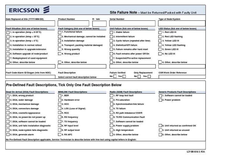 Site Failure Note – Must be Returned/Packed with Faulty Unit