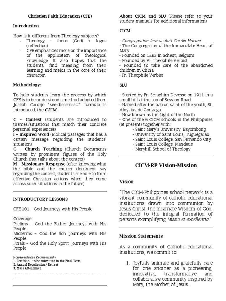 Christian Faith Education (CFE) About CICM and SLU (Please refer to your