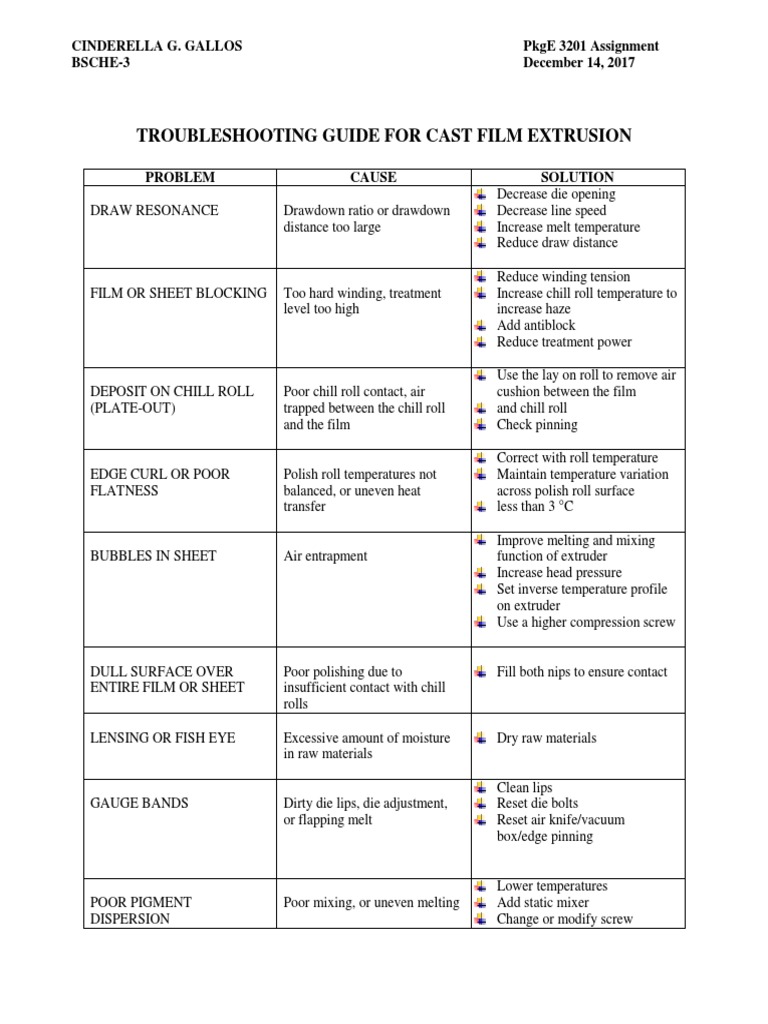 TROUBLESHOOTING GUIDE FOR CAST FILM EXTRUSION