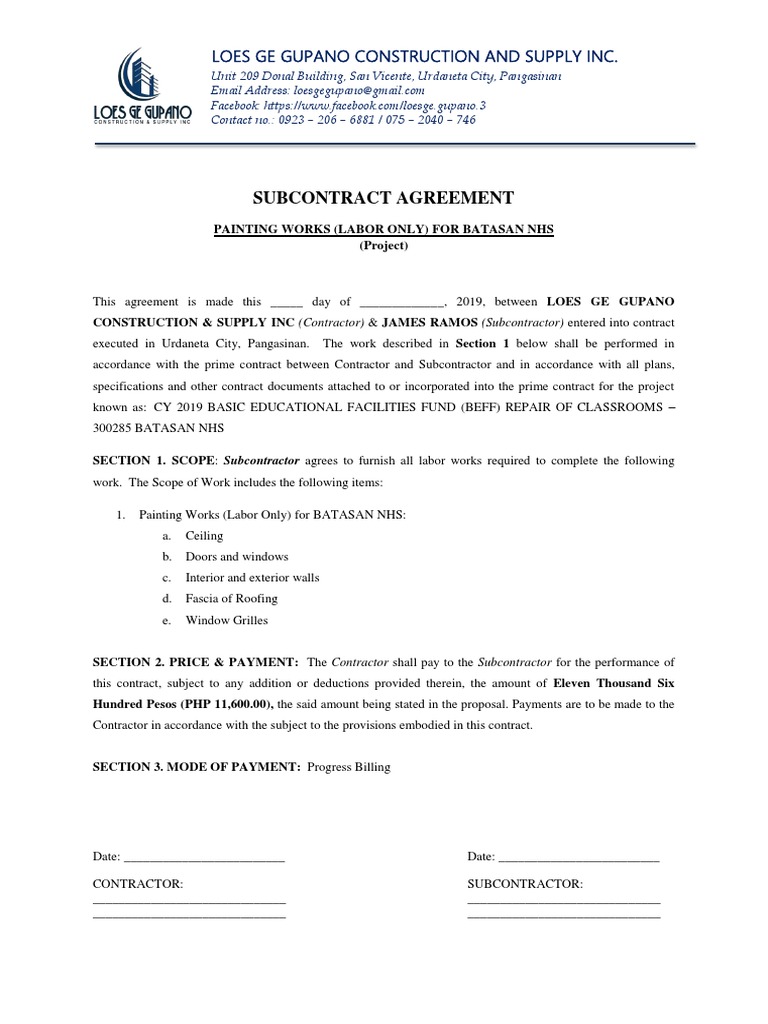 (PHP 10,000.00), the said amount being stated in the proposal. Payments are to be made to the Subcontractor in