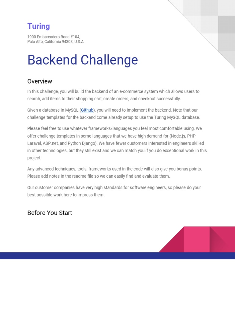 challenge templates for the backend come already setup to use the Turing MySQL database.