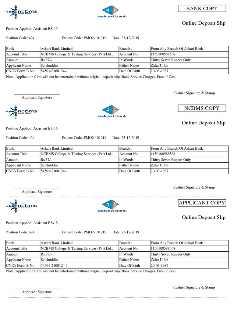 Note: Application form will not be entertained without original deposit slip. Bank Service Charges, Free of Cost.