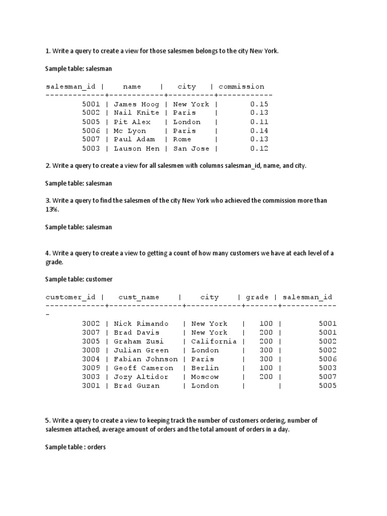 1. Write a query to create a view for those salesmen belongs to the city New York.