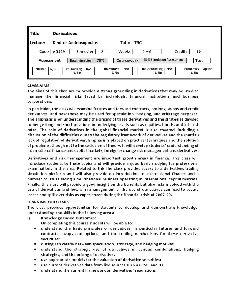 In particular, the class will examine futures and forward contracts, options, swaps and credit