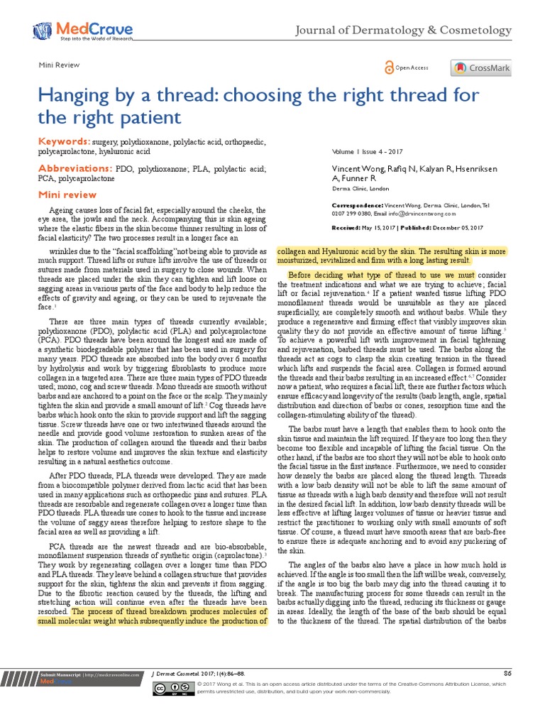 Citation: Wong V, Rafiq N, Kalyan R, et al. Hanging by a thread: choosing the right thread for the right patient. J Dermat Cosmetol. 2017;1(4):86‒88.