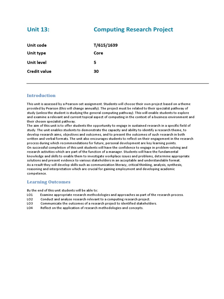 study. The unit enables students to demonstrate the capacity and ability to identify a research theme, to