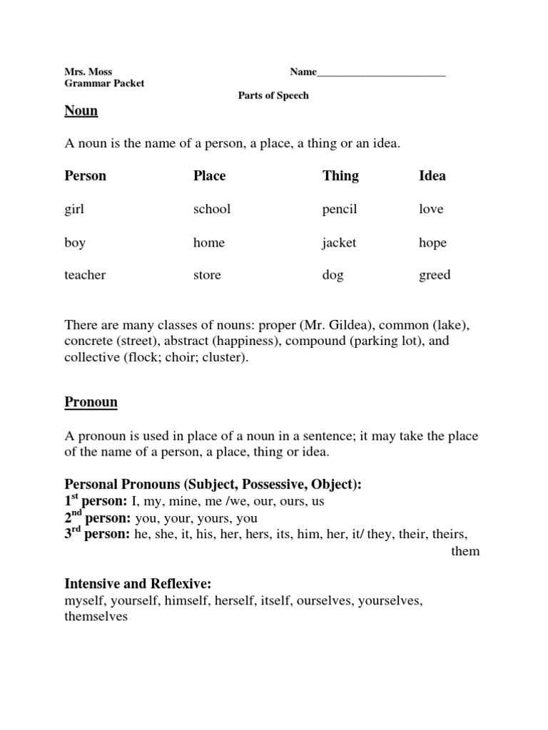 Mrs. Moss Name - Grammar Packet Parts of Speech